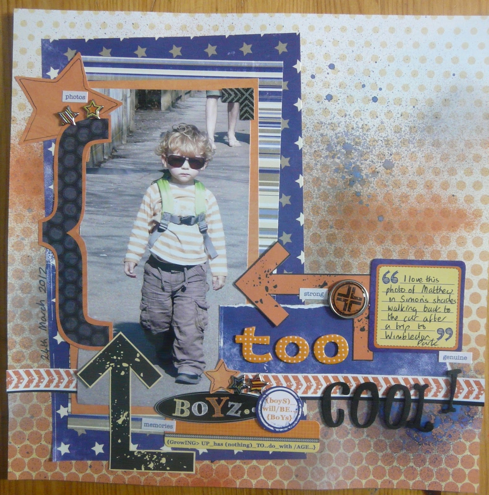 The last layout is probably my favourite of the seven layouts. I love this photo of Matthew looking super cool after a trip to Wimbledon Park and wearing his Dad's shades. Not yet two in this photo - he looks so grown up - I can see the teenager in him already!! I used a mix of old papers by Kaisercraft. I love the sprayed inks in the background and should do this more often as I always love the result.